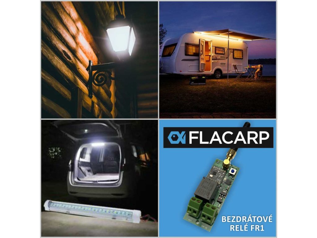 Small wireless relay module. It allows to control external appliances by FLACARP products, e.g. switch on the light in the caravan, cabin ... via FLACARP receiver, bite alarms, motion alarms...